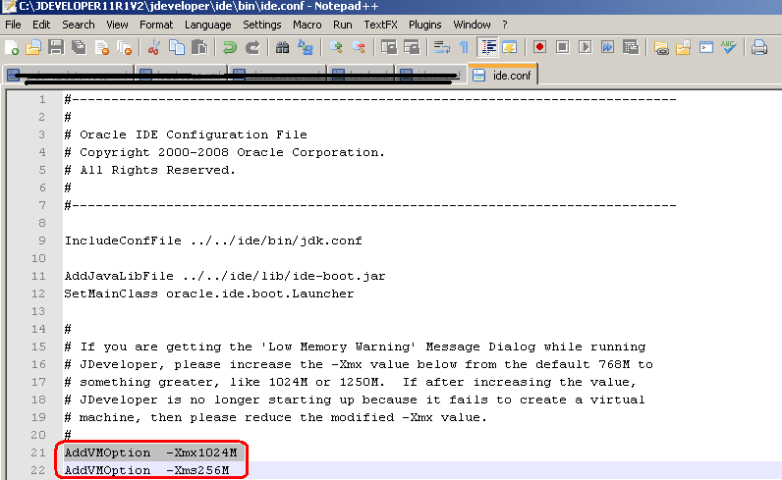 Quick look at jdev.conv showed it reference ide.conv and did not have anyline that specified the VM args Xmx and Xms. Finally, looked in ide.conf and found it [image 2 – below].