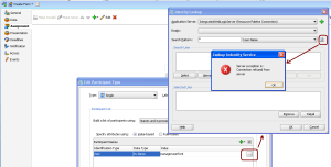 However, if it does not show you the above and instead gives you an “Sever exception is: Connection refused from server” when you click on the icon titled “Lookup” (little magnifying glass over a page icon) …then you might be getting the following exceptions (see below) in your logs (I managed to catch the stack trace in another screen trying to do the same sort of work – i.e. connect to the appserver and get users from it).