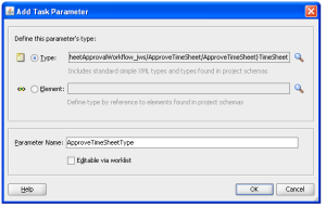 End result … your Task has your user defined type for a payload. Now you can add data to this from a BPEL flow or an external call (convert your Human Task to an invoke-able “Composite with Service Bindings” by selecting that option when creating the task).