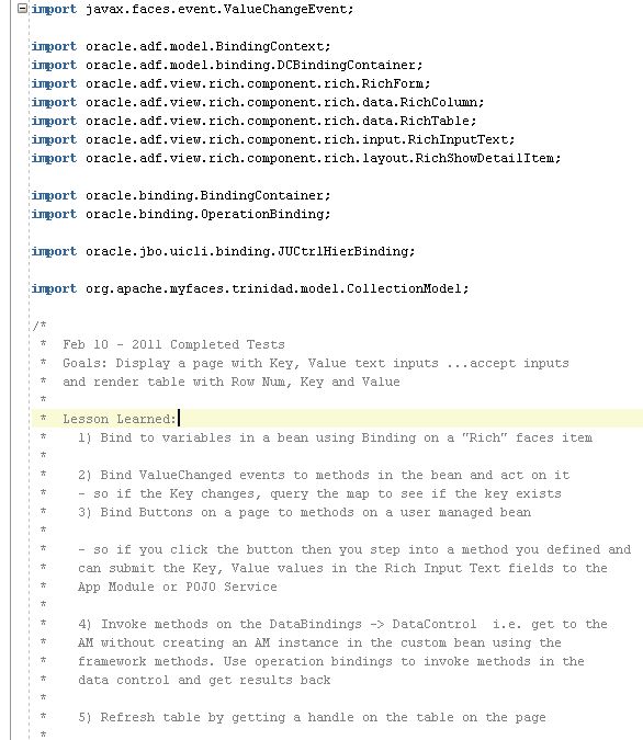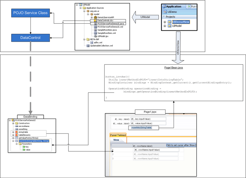 The overall project will look something like this:  Data Controls built from the POJO service will be available to the UI via Data Bindings. The page will consist of 3-4 components (two Rich Input Texts, One Button and One Table). The page (and its 3-4 components) will be backed by a custom bean (Managed Bean) , that is …. there will be a “Java class” with RichInput Text fields, RichTable field and methods that accept ValueChangedEvent etc. There will be a definition in the ADF config file about this class which will tie this to the JSF page so that details of the fields are available to the class (as you change it on the screen) and when you click the button component on the screen it invokes a method on the class.