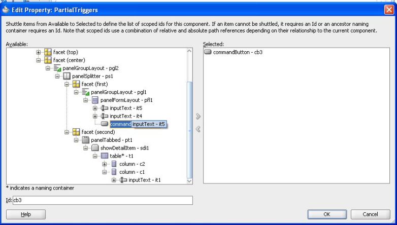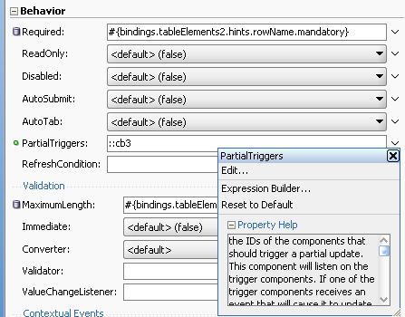 As explained above, the page bean has the meat of the logic. We could have entirely avoided this using out-of-box PP, this is done by clicking on the Rich Component (you want to be refreshed) and  under “Properties -> Behavior” selecting “Partial Triggers” to specify a trigger that will cause a partial page refresh for this component.