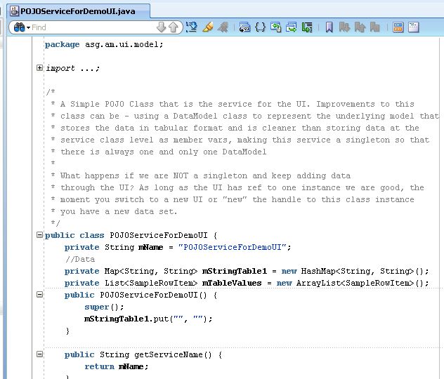 The application is a very simple, two project fusion web app. It has a Model and View project – the model was started from a POJO Service class (I don’t use any patterns to ensure that multiple instances of the service class refer to the same data model etc – it is very basic).
