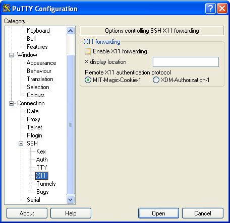 - Check/Select “X11 Forwarding” in Putty (see image below) by selecting check-box under “Category: Connection -> SSH -> X11” in the Left-hand panel and “SSH X11 forwarding” in the Right-Hand Panel