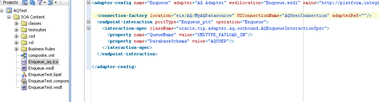 Lets start from JDeveloper, I created a simple composite that uses an AQAdapter to Enqueue and XML
