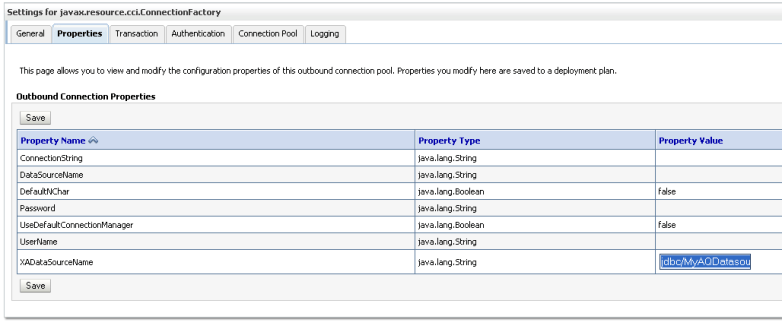 Have a look at the JCA Properties for the Queue, the JNDI name can be changed to anything you like but must be consistent with what you configure later. For example, I use “eis/AQ/MyAQDatasource” in this example to match the name of the datasource I will be using. Because the AQ Queue is Database backed … the JNDI for the AQ Queue refers to a configuration that contains the JNDI for a XA Datasource. In my example it is “jdbc/MyAQDatasource”