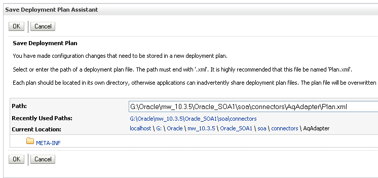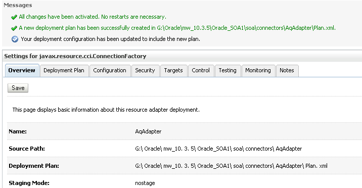 Weblogic requires a “weblogic-ra.xml” along with the “ra.xml” file in the “META-INF” folder of the RAR file for the adapter.  The trickiest part is getting the Web console to apply changes … what I mean is that initially I tried to “Update” an existing “Deployment” of AQAdapter from the Weblogic Admin Console and it blew up … later I found out because the AQAdapter was packaged up in a RAR file (and not exploded on the filesystem) …as a result my changes from the console were not making it through.