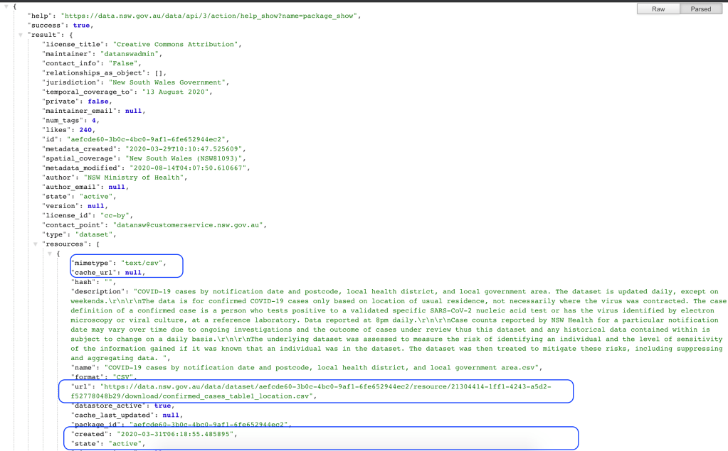 - JSON Sample: https://data.nsw.gov.au/data/api/3/action/package_show?id=aefcde60-3b0c-4bc0-9af1-6fe652944ec2