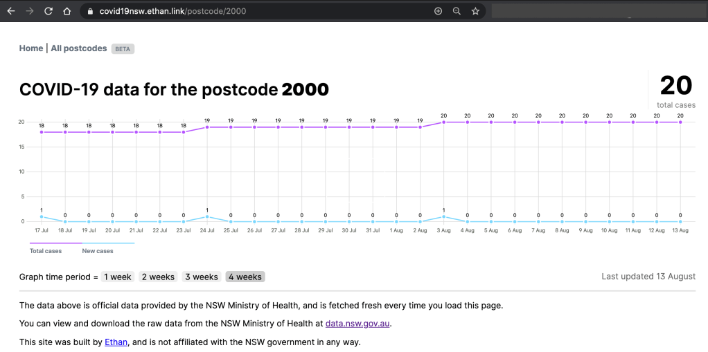 However it was Ethan’s site that I loved the most as a “local consumer” to see what is happening in my postcode – the website here https://covid19nsw.ethan.link/ is a brilliant example of the citizen science and is sourced from the NSW Health open data link above