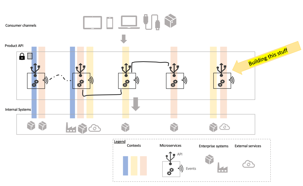 We then use this analysis to design our solution with APIs, events and microservices to maximise reuse and reduce crippling coupling