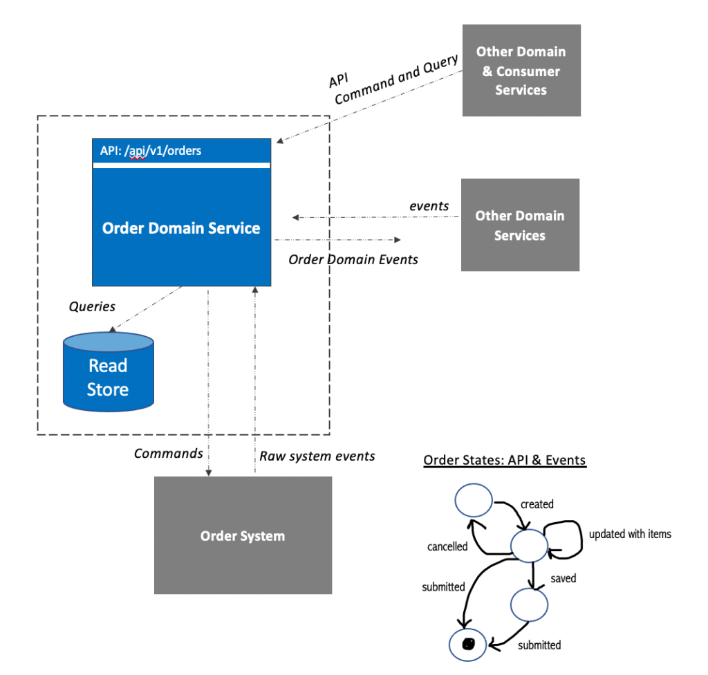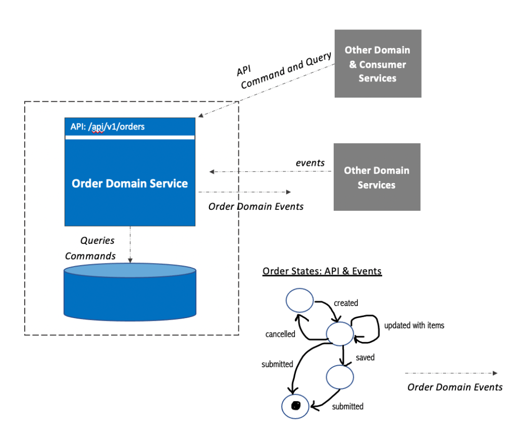 Domain services provide APIs for Commands and Queries and emit events called Domain events. These operations manage the state of a domain resource (HATEOS anyone?)