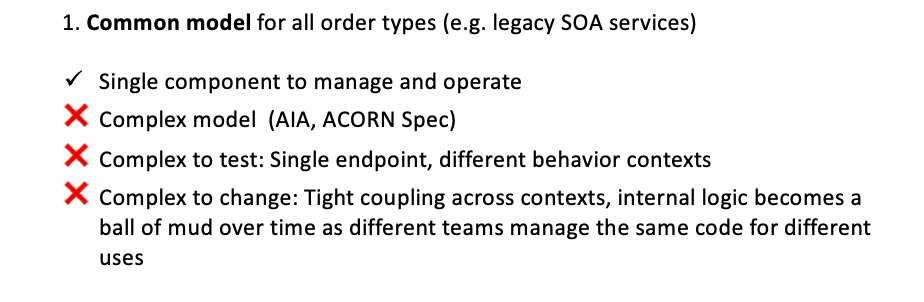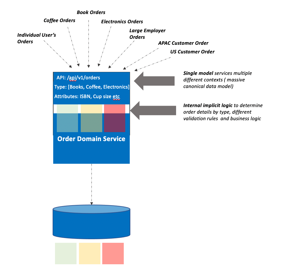 - Monolithic Service: Single endpoint, large canonical data model, coupled contexts across different domains (SOA)