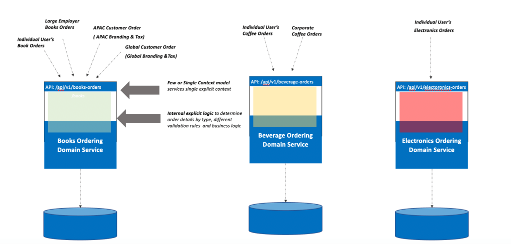 - Explicit context, unique service: Micro or Coarse-grained services with multiple contexts owned by the same team for a single domain service