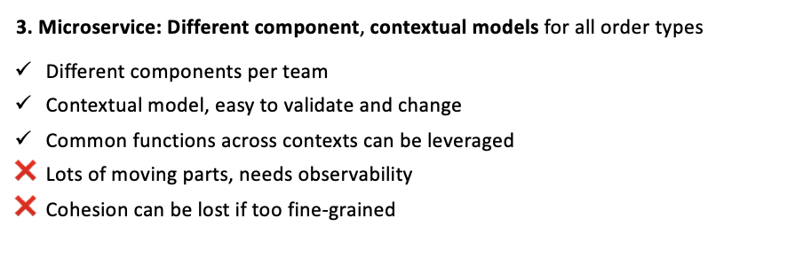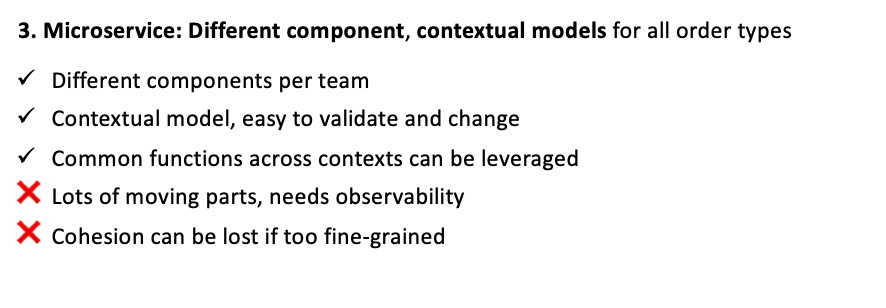 - If the domain boundaries are not clear, then a large domain monolithic service can emerge coupling multiple teams