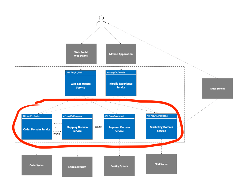 Domain services implement core logic for a business domain and are a relied upon by experience and consumer services. Domain services can be self contained and store the business logic and state or rely on an external provider system (translating from a “raw system format” to a “canonical” domain format)