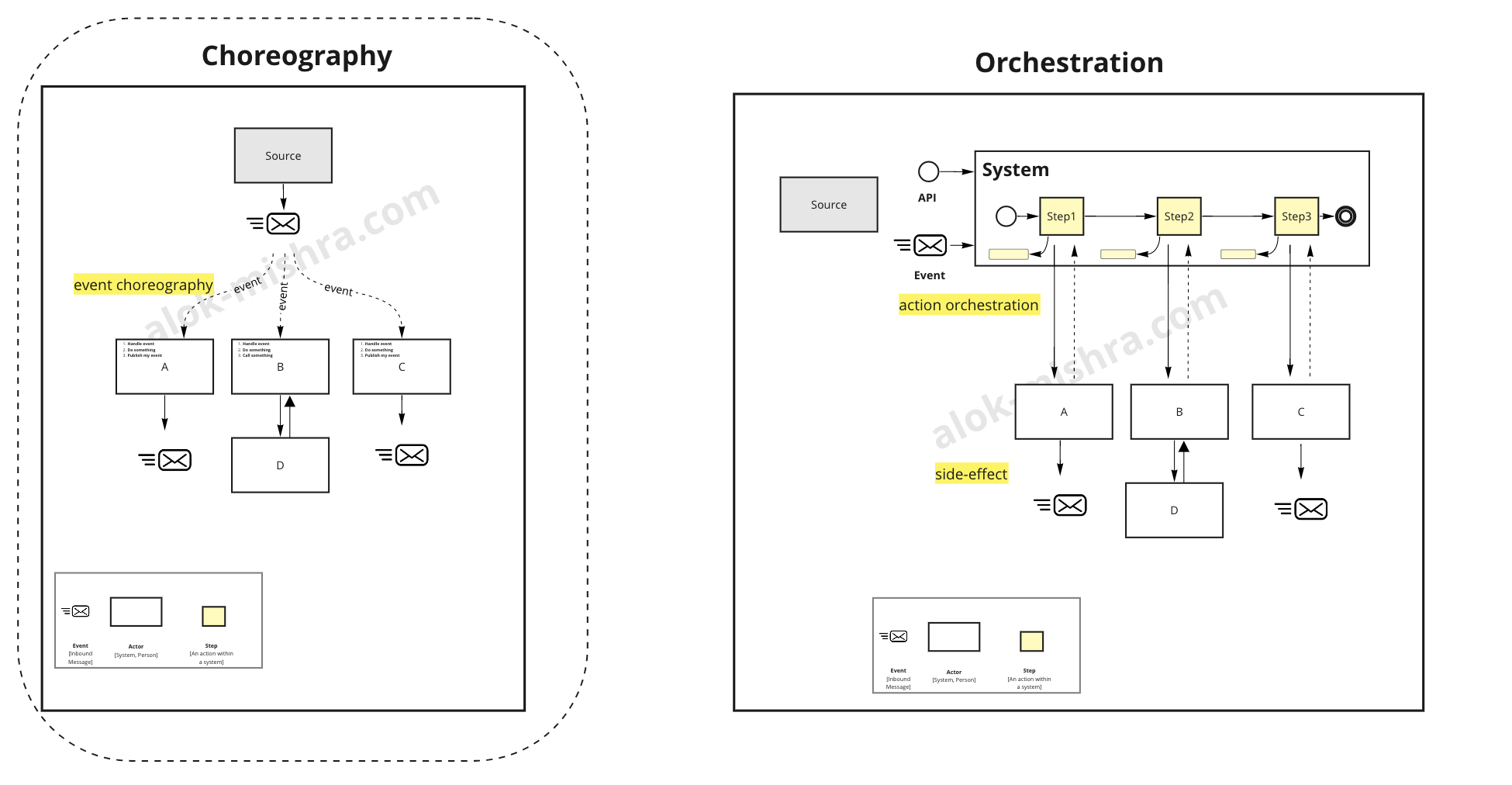 After you recognise and understand the key event-driven patterns you can now build complex solutions using event choreography. Note this is a specific solution style and different from orchestration where a central orchestrator drives the outcome. An orchestration can use events between the orchestrator and the services