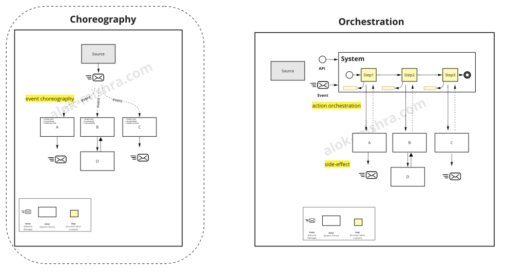 The state transitions happen on “saved”, “submitted” etc above and the events from master system to downstream subscribers can trigger reactions (or nothing). These reactions can be part of a Choreography solution