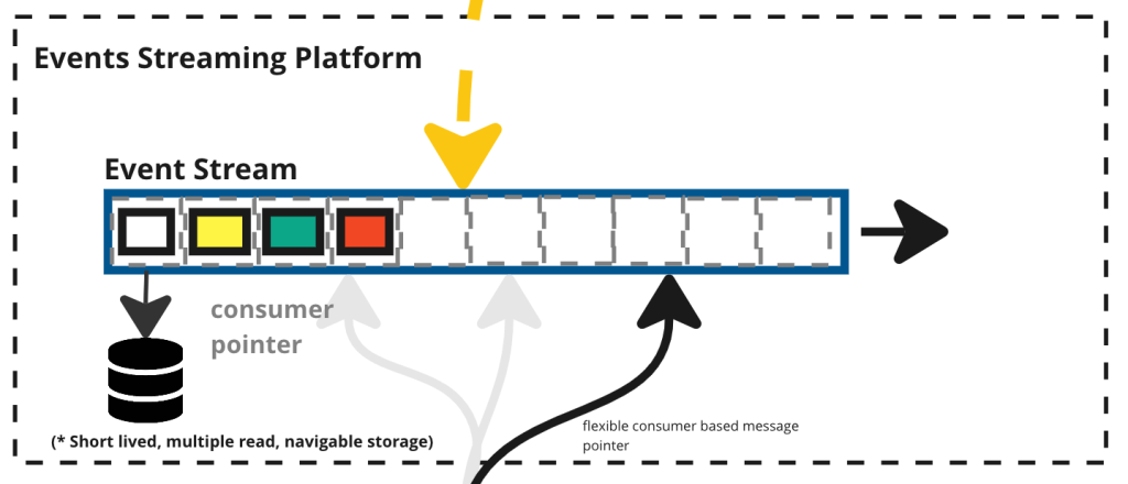 2.2.2.2 Using streaming platform for Events like Salesforce Platform Events: For more advanced consumption requirements (with longer persistence, message playback across a small window) an event streaming platform can be used. For example, we have seen an evolution of the messaging infrastructure into streaming platforms which can provide the consumers the ability to replay messages up to a certain period in time (e.g. Salesforce platform events vs generic events) using a consumer specific pointer.