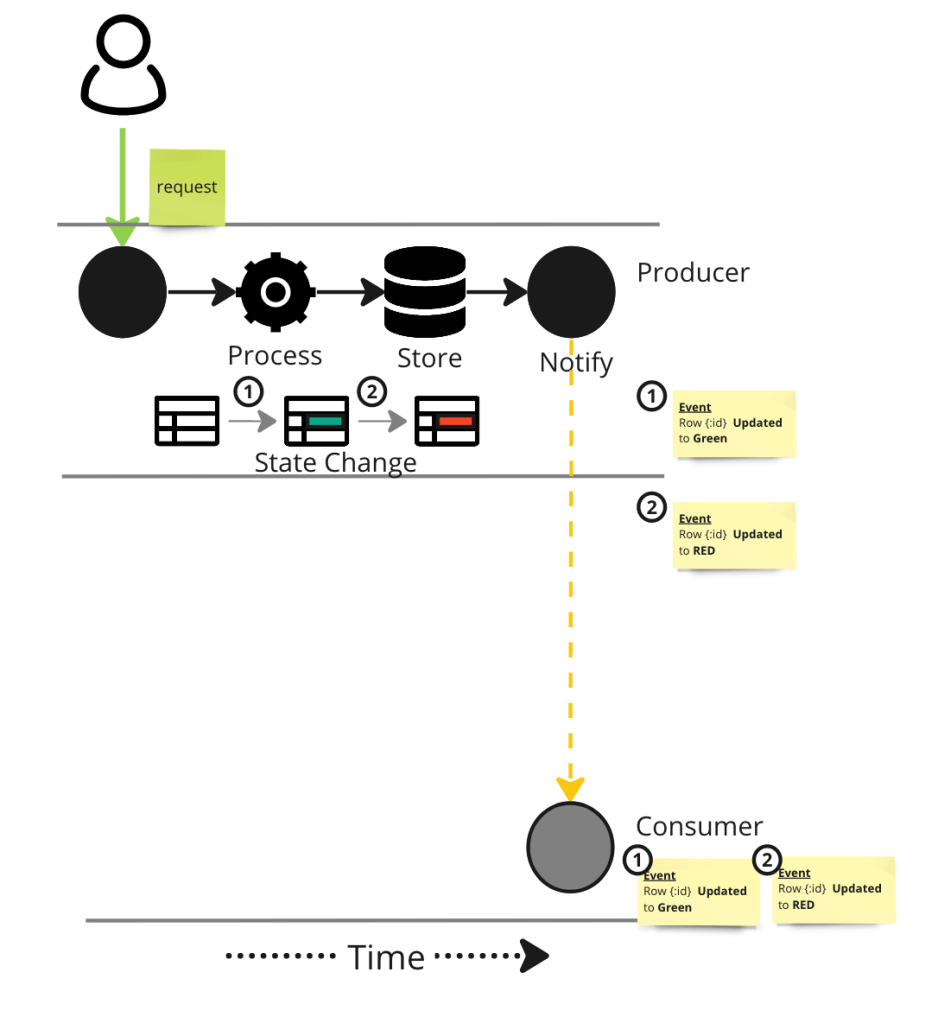 Events with state and data are delivered using similar messaging infrastructure however given the need for ordering and persistence there are first-in-first-out (FIFO) channels and durable stores to support the transport