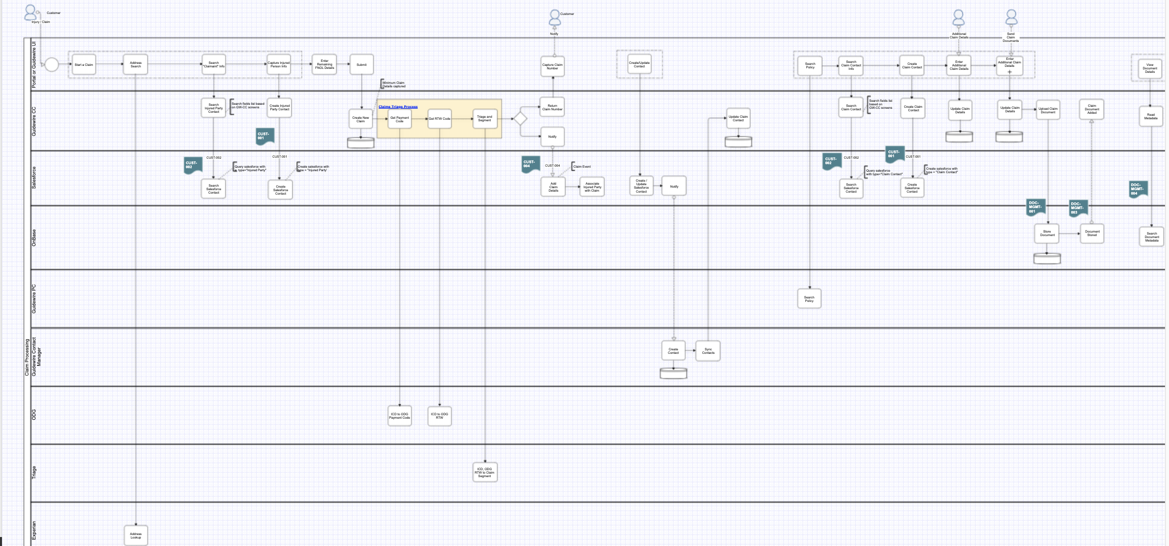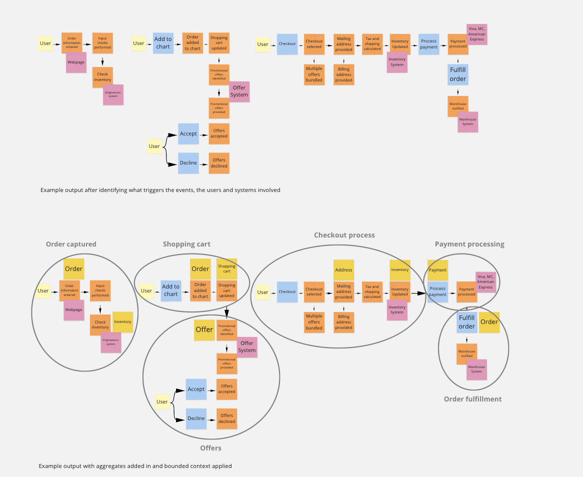 These contain stories of a specific user and their interactions (queries, commands) with systems to achieve a business outcome. These diagrams can be analysed into DDD models, commands and queries for APIs & Events etc.