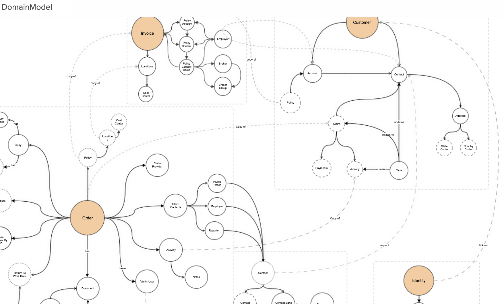 These diagrams show how the information model is represented in the software. Domain aggregate map is not the same as a database entity-relationship model. Aggregates are coarse and over a business domain or an interaction context, what is persisted may be parts of an aggregate in different tables. It often helps to show these aggregates in a spider-diagram with value objects and also systems – showing the master systems and copies in other systems