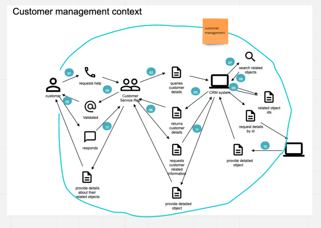 The customer management Domain Story should look familiar. The key thing to ask is how the customer related information gets to the CRM system to build a 360 view and what is stored in the CRM system