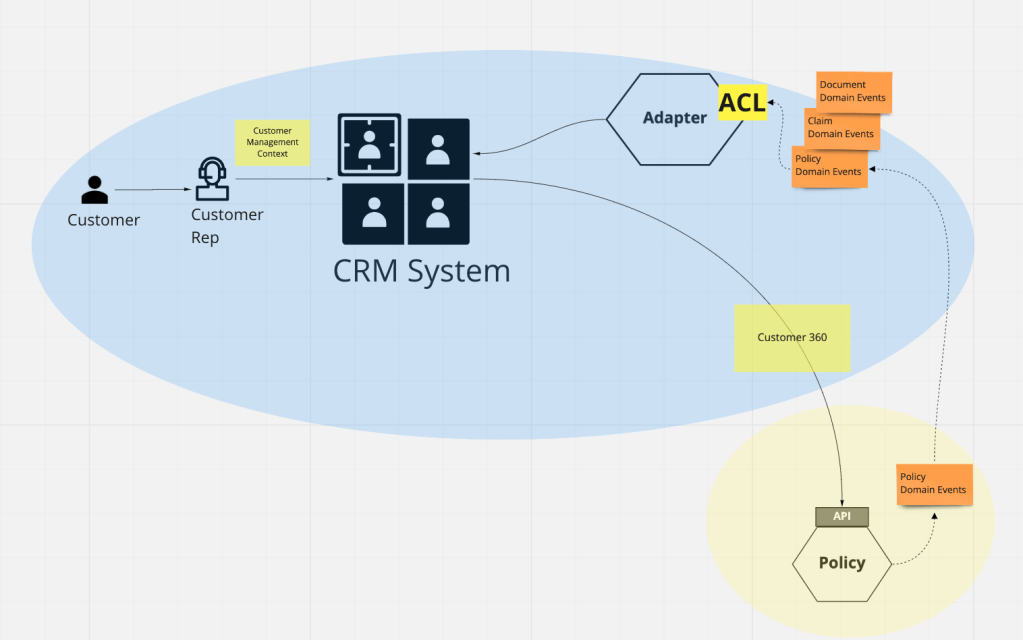 This shows that the CRM context depends on the other contexts via open-host services (OHS) and implements an anti-corruption layer (ACL) when invoking the services or receiving events.