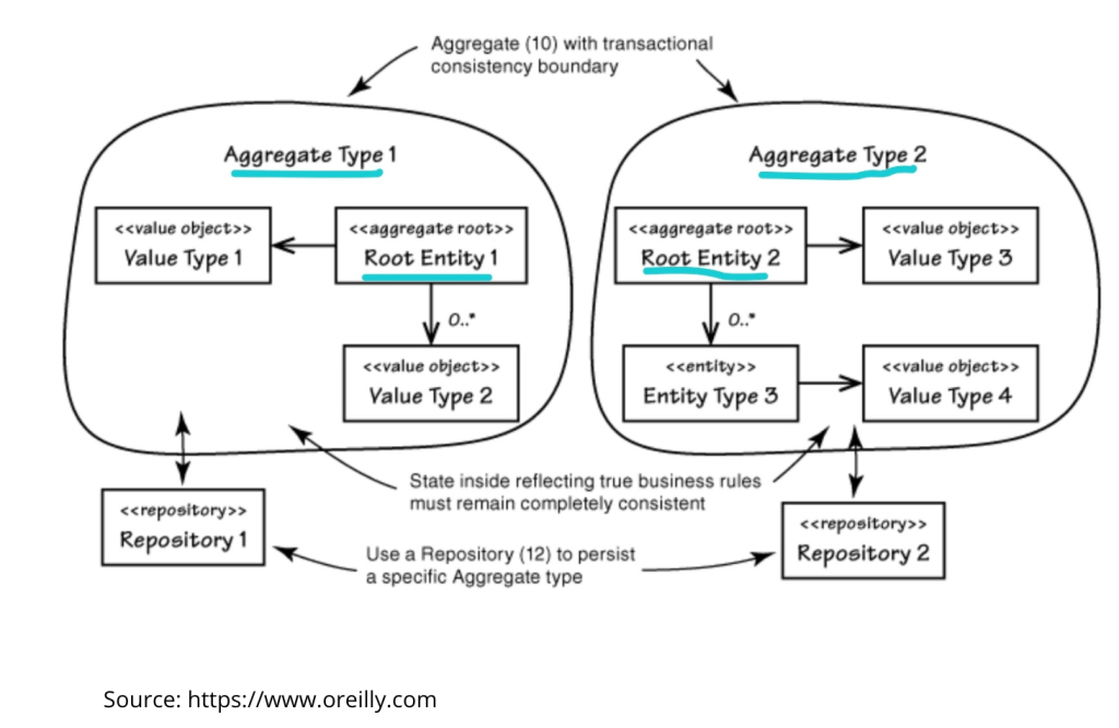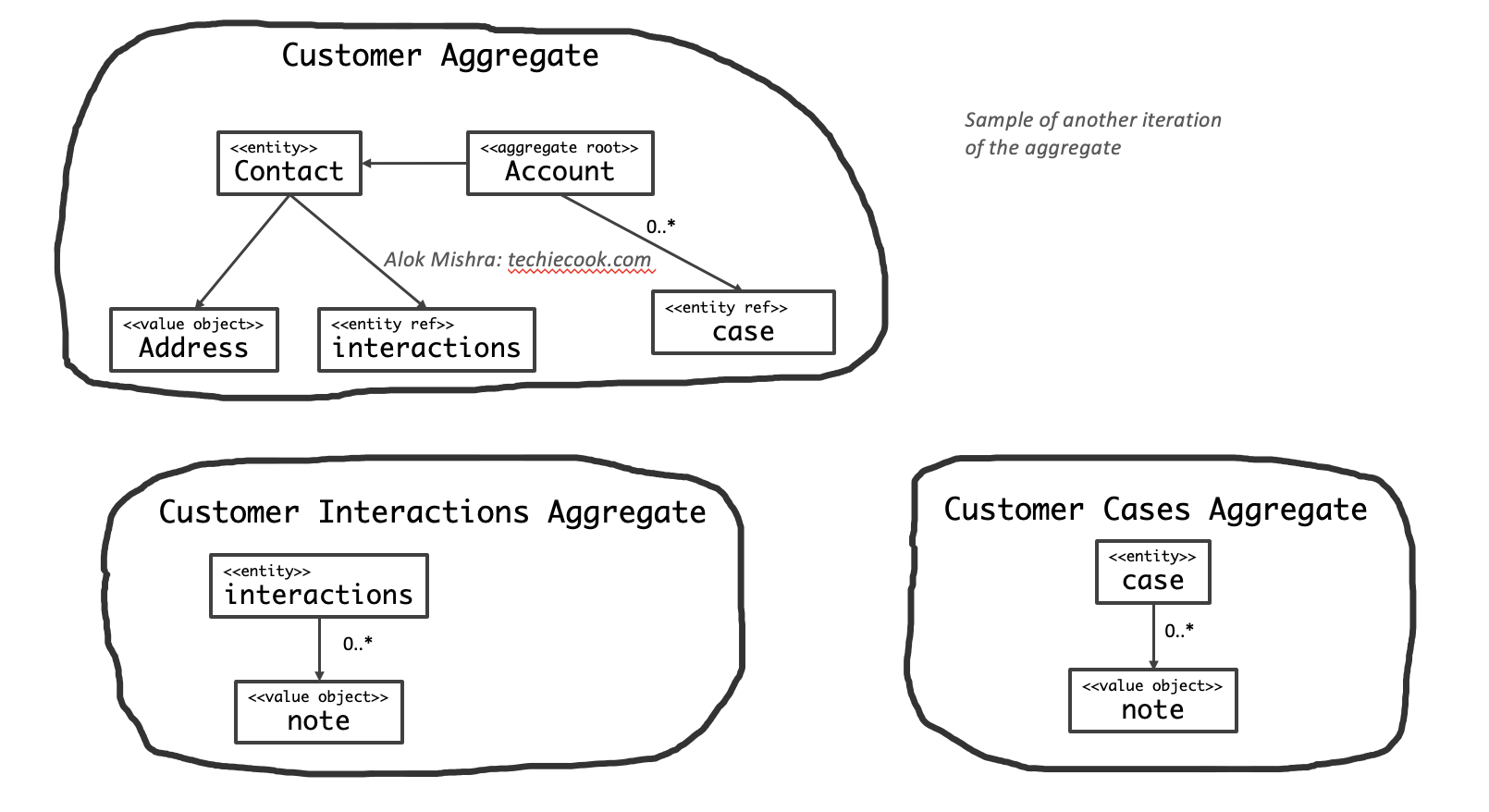 Iterating over a domain aggregate involves testing the transactional boundary of the domain story where this aggregate is used and asking is this too big or too small as a unit of change. Remember, a domain aggregate contains 1 root entity atleast and an entity is something that has an identifier and you manage the lifecycle for
