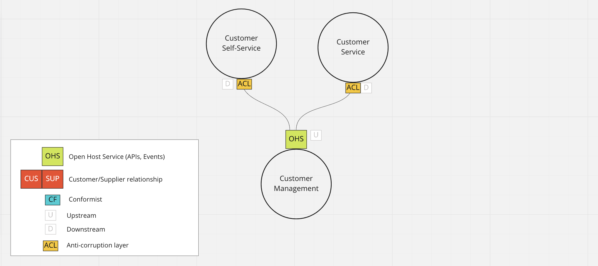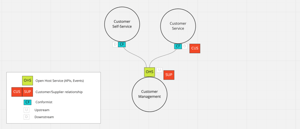 In the above example, the two downstream contexts are conforming to the model without anti-corruption and obviously impacted by change. Also, as a hypothetical scenario, we added a “customer-supplier” relationship between the Customer Service Management context and the Customer Management context