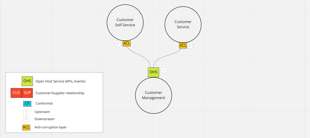 Sorry, back to our core topic. The key then is to add an anti-corruption layer which is represented in a context-map like this