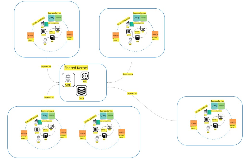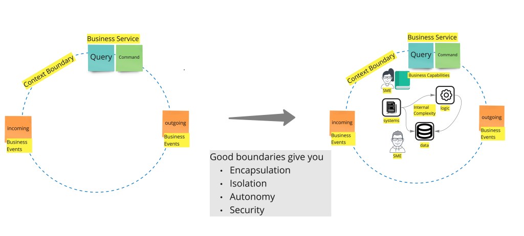3. Boundaries: Having good boundaries can help with encapsulation of information, isolation and as the organisation scales good boundaries can help teams stay autonomous through as-a-service model. If internal and external teams are able to deliver new solutions without dedicated support from service provider teams, then this leads to greater autonomy and faster release of new features. Good boundaries force teams to interact via services (and events) so they are not coupled via physical infrastructure (common database or code) or concepts (no need to know the internals just consume a service). Good boundaries help organisations build a collection of services aligned to business capabilities and offer partners and new consumers these services in new contexts to discover new opportunities and revenue models