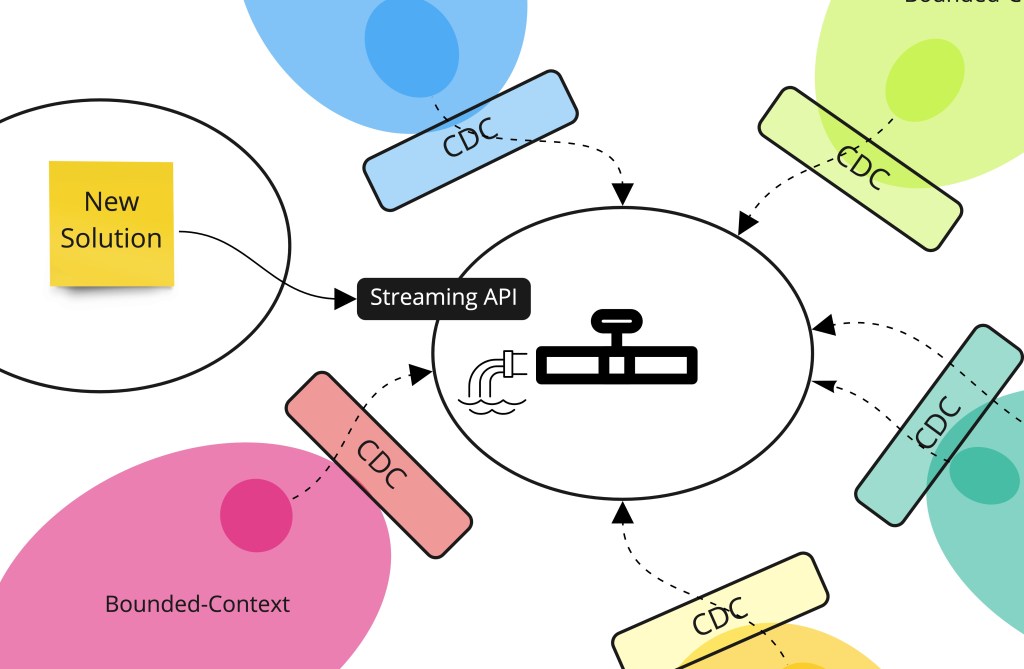 One approach to improve data quality and reduce callbacks to core system of record is to use an event stream. This stream is populated by the various contexts with their data and acts like a central log of changes. New solutions would simply consume the streaming API to read from a stateful stream on events and event start writing to them to build extensibility