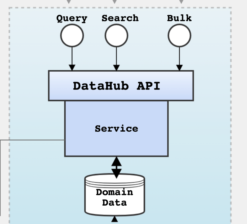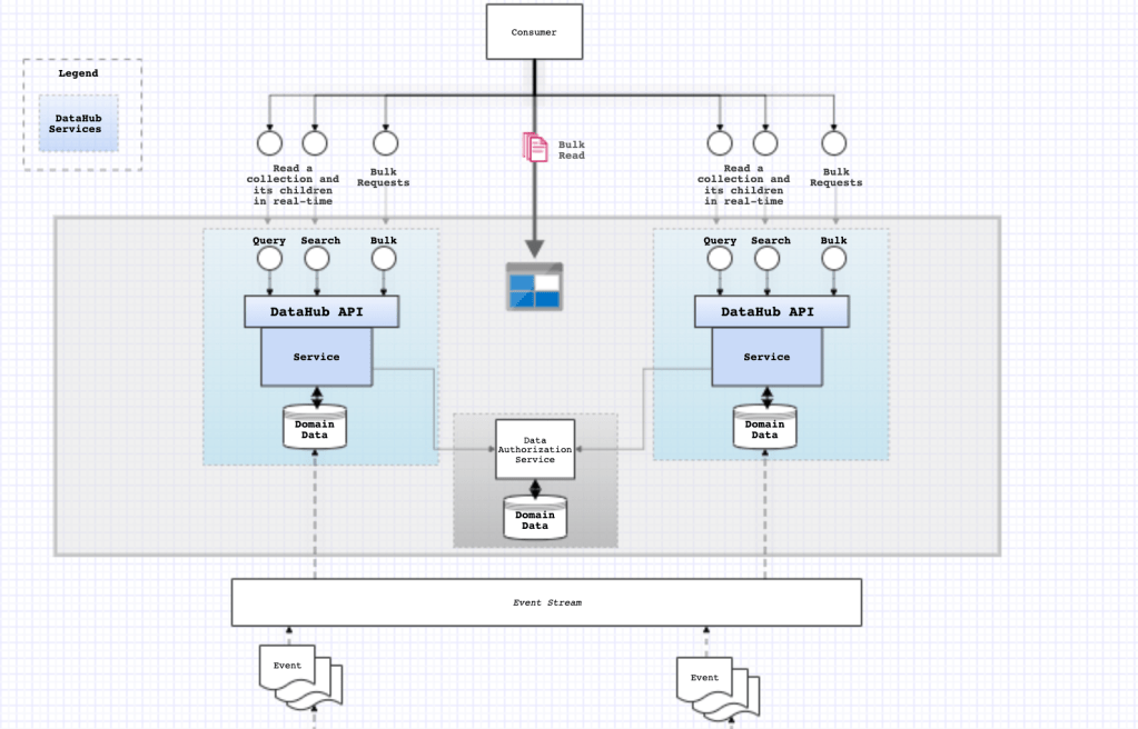 Before we look the ways to get the information, let us look at what our Data Hub architecture might look like. Below is a rough outline of how a consumer can query multiple domain APIs