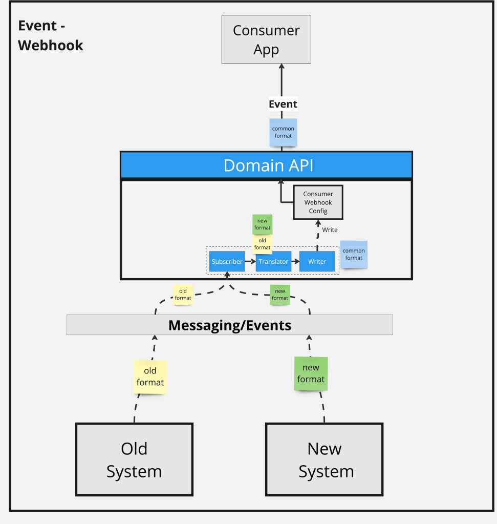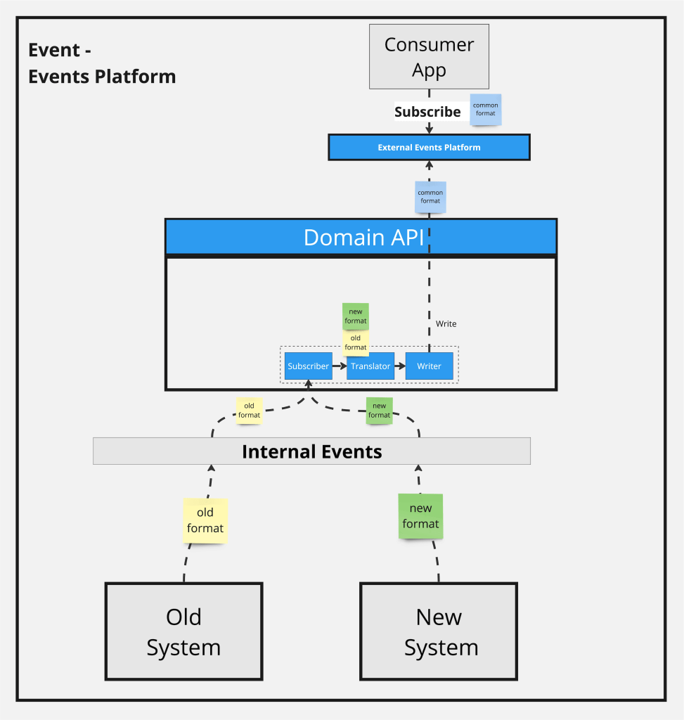 - Internal Events: Generated by old and new systems, collected by the domain API.