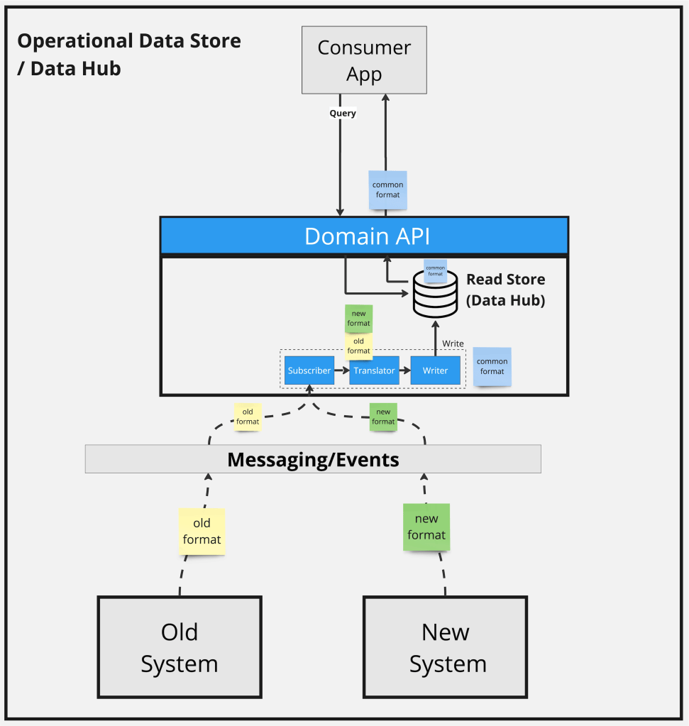 - Read Store (Data Hub): The central repository where data is stored in new and old formats.